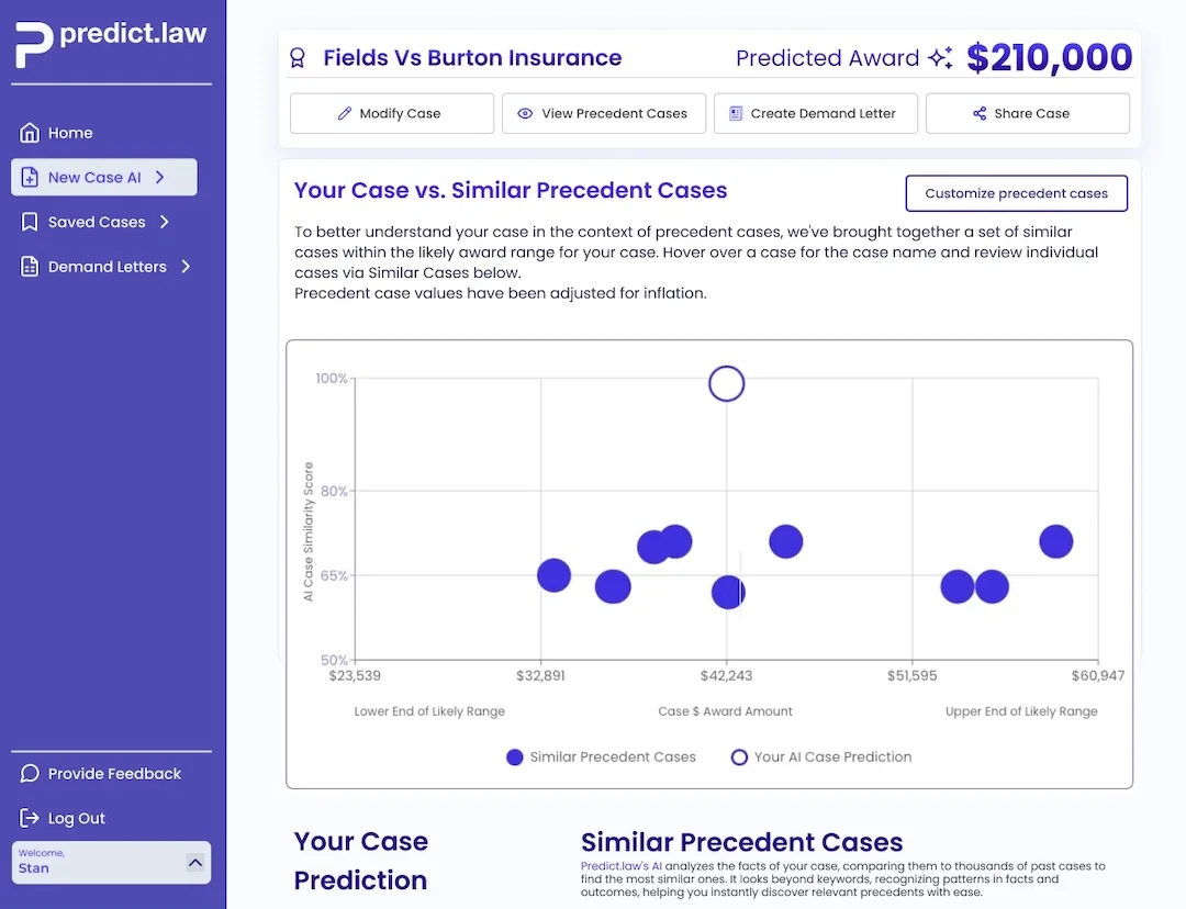 Adjust factors like jurisdiction, judge, or injury severity to test “what-if” scenarios and see how outcomes shift.